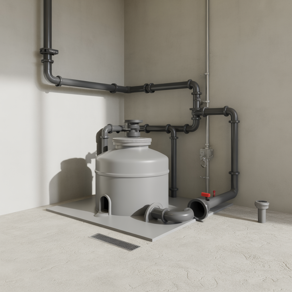 Installationen utfördes enligt AMA VVS & Kyl med PP/PE-rör och muffade skarvar i dimensioner anpassade till beräknade flöden, huvudsakligen DN110 på stam och DN75 på grenledningar. För att säkerställa rätt hydraulik lades ledningarna med kontrollerat fall mot avskiljaren och med rensmöjligheter på strategiska punkter. Golv bilades kontrollerat, schakt bottnades och avskiljaren placerades på stabil bädd med invägd nivå. En backventil monterades för skydd mot bakvatten och avluftning anslöts till befintlig ventilationsstam. Hög-nivå-larm installerades och provkördes. Efter färdig rördragning återställdes bjälklag och golv genom armerad gjutning och flytspackel, och ytor lämnades redo för verksamhetens egna ytskikt.