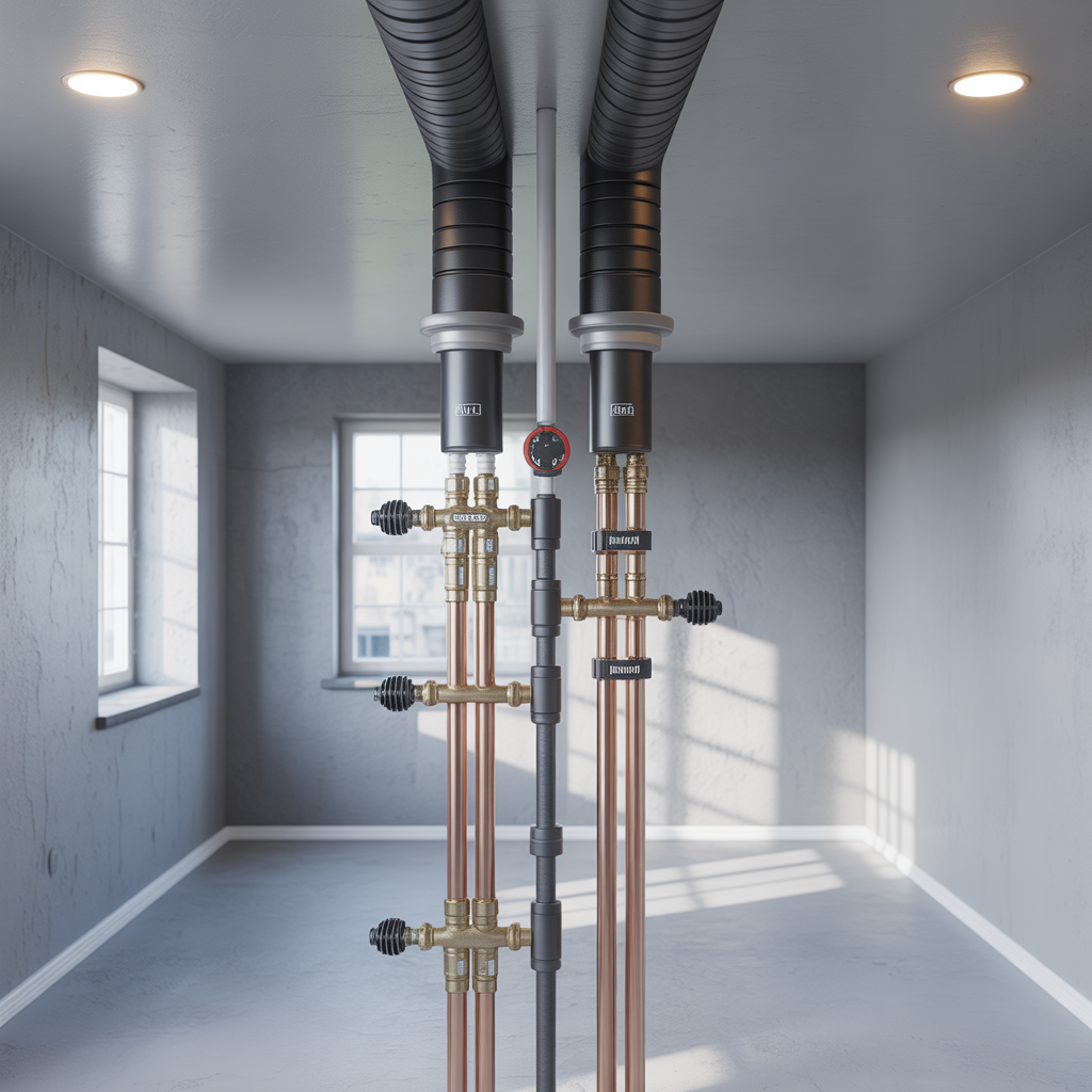 Tvårörssystemet byggdes med separata tillopps- och returledningar längs källartak och i schakt, med dimensionerade koppar- och flerskiktsrör samt isolering på samtliga stam- och distributionsledningar. Radiatorerna försågs med förinställningsbara termostatventiler och avstängning på retur, och varje stigstråk fick injusteringsventil och avluftning i högpunkter. På huvudledningarna installerades differenstrycksreglering och avstängningsmöjligheter för sektionering, liksom avtappning och filter på retur för att skydda anläggningen. Genomföringar brandskyddades och rören monterades med lämpliga avstånd och fall för att underlätta avluftning. Samtliga nya sträckor spolades rent före idrifttagning och fylldes med behandlat vatten.